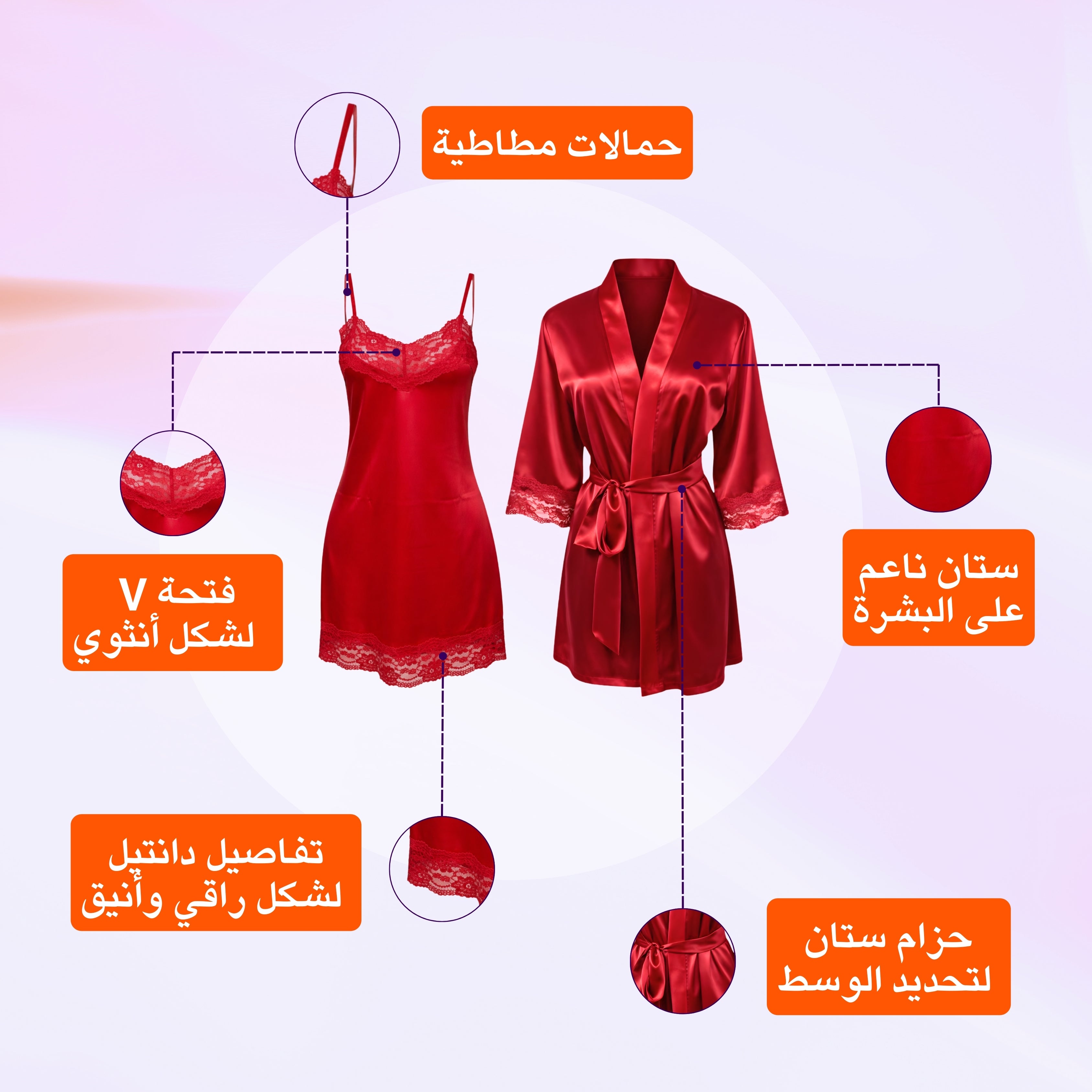 - Satin with Lace Set featuring a short nightgown and a matching robe with a glamorous, glossy finish.